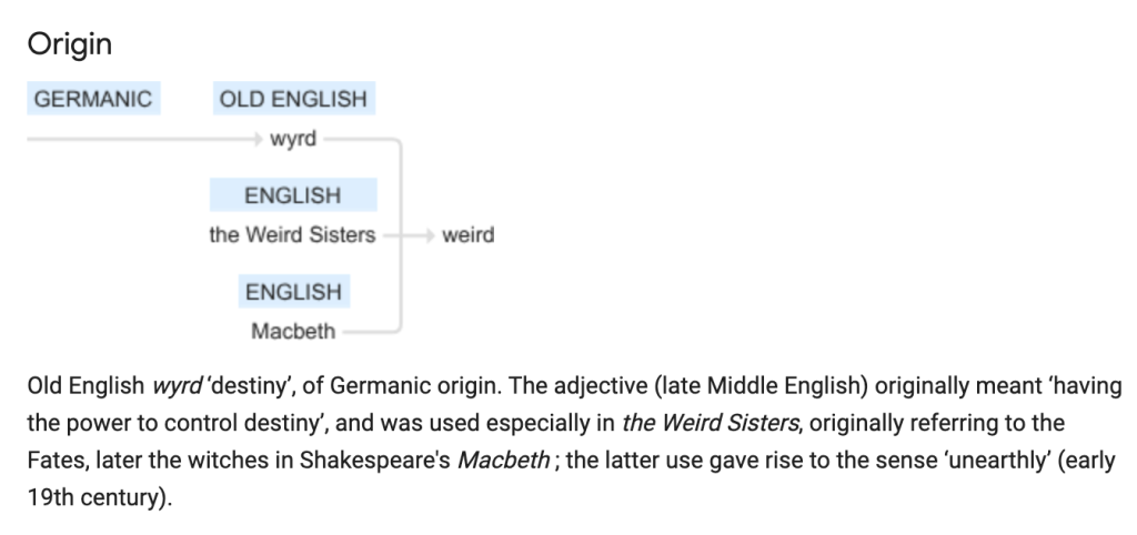Interesting, that I should suddenly spit out that little word “weird.” Hmmm. . . etymology?