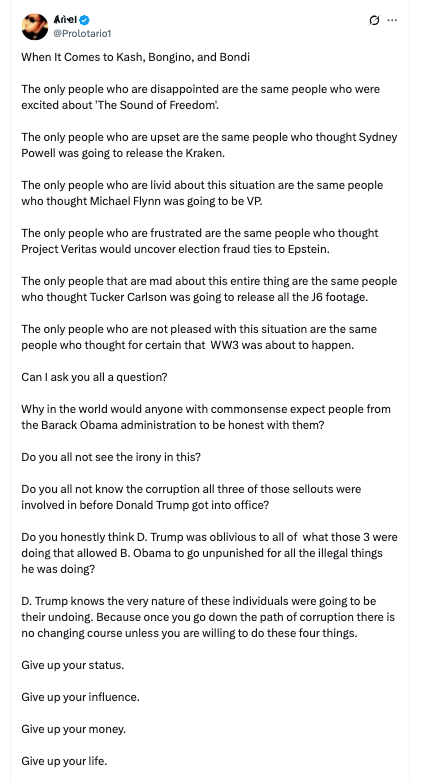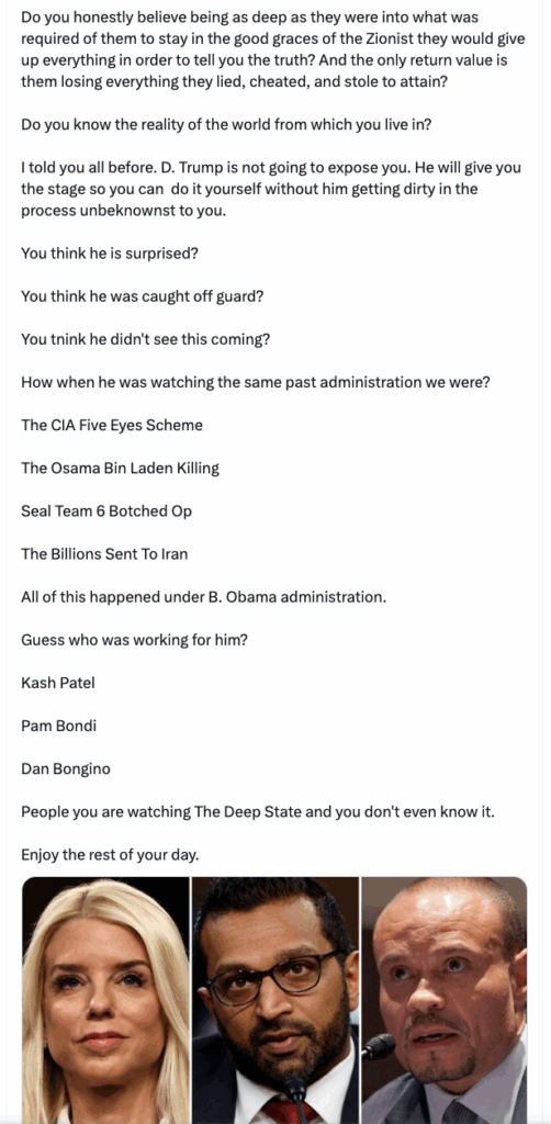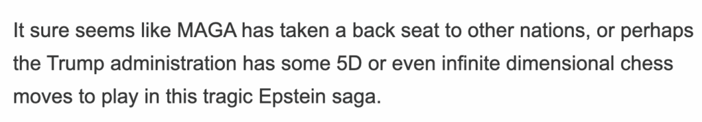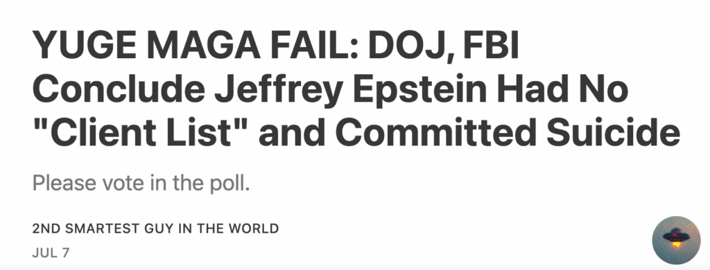 Seldom do I put up more than one post a day. (In fact, I’ve been delberately confining myself to four posts each week, Monday through Thursday.) However, late yesterday’s bombshell “news” from Bondi and Patel that the Epstein files do not exist, certainly got my attention.