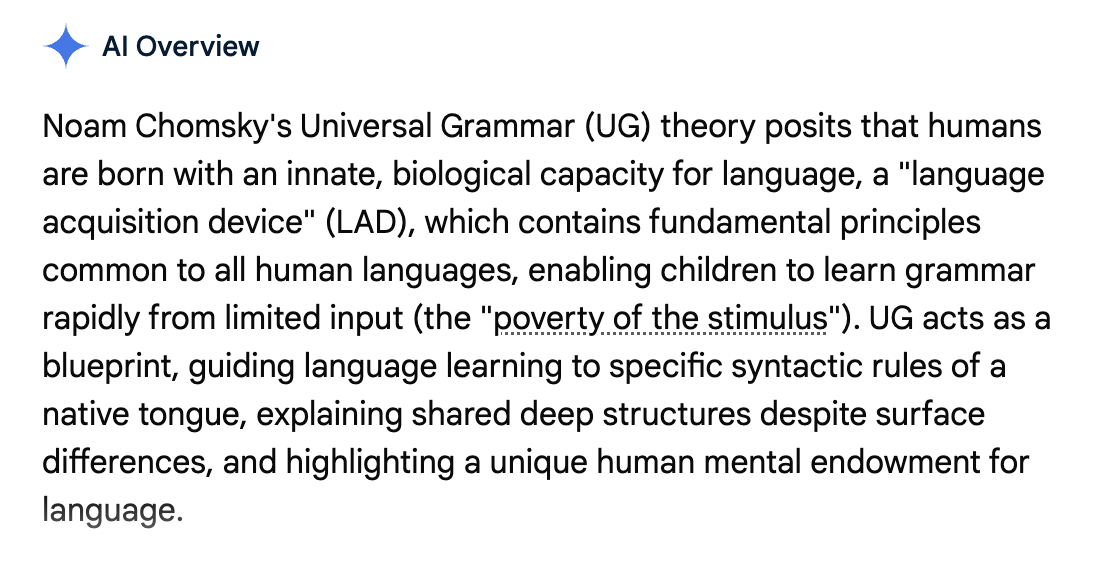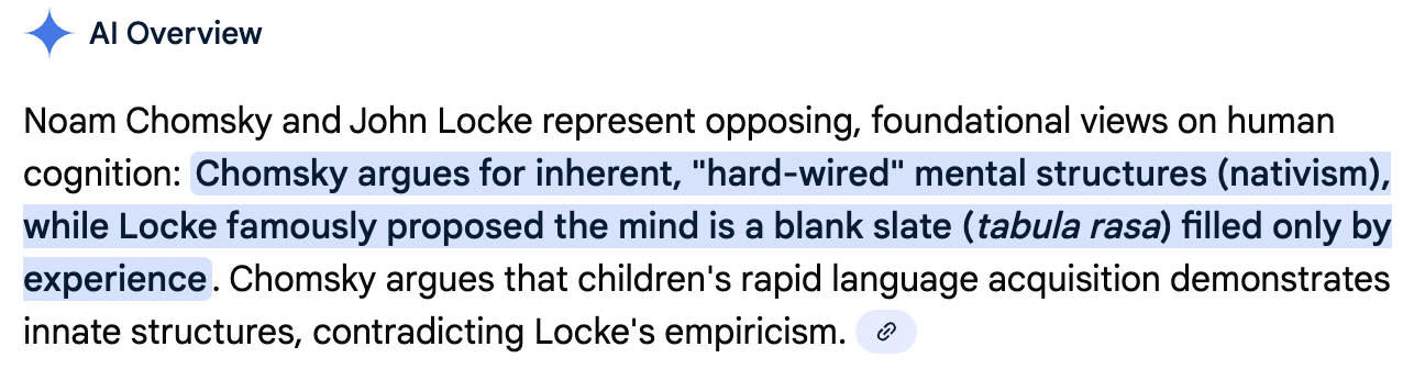 In other words, according to Chomsky, John Locke is wrong. There’s no such thing as a tabula rasa, a mind that is blank.
