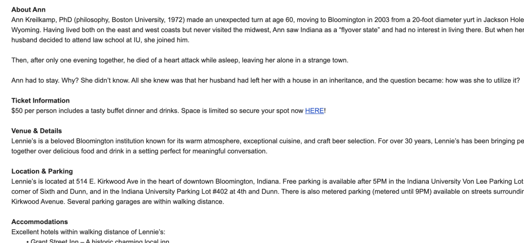 Then, this morning, this email from Joni McGary, the organizer of the Supper Clubs, a reminder to her list of what’s coming on December 8. Her timing, for me, couldn’t be more precise!