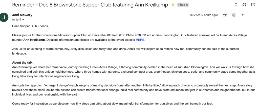Then, this morning, this email from Joni McGary, the organizer of the Supper Clubs, a reminder to her list of what’s coming on December 8. Her timing, for me, couldn’t be more precise!