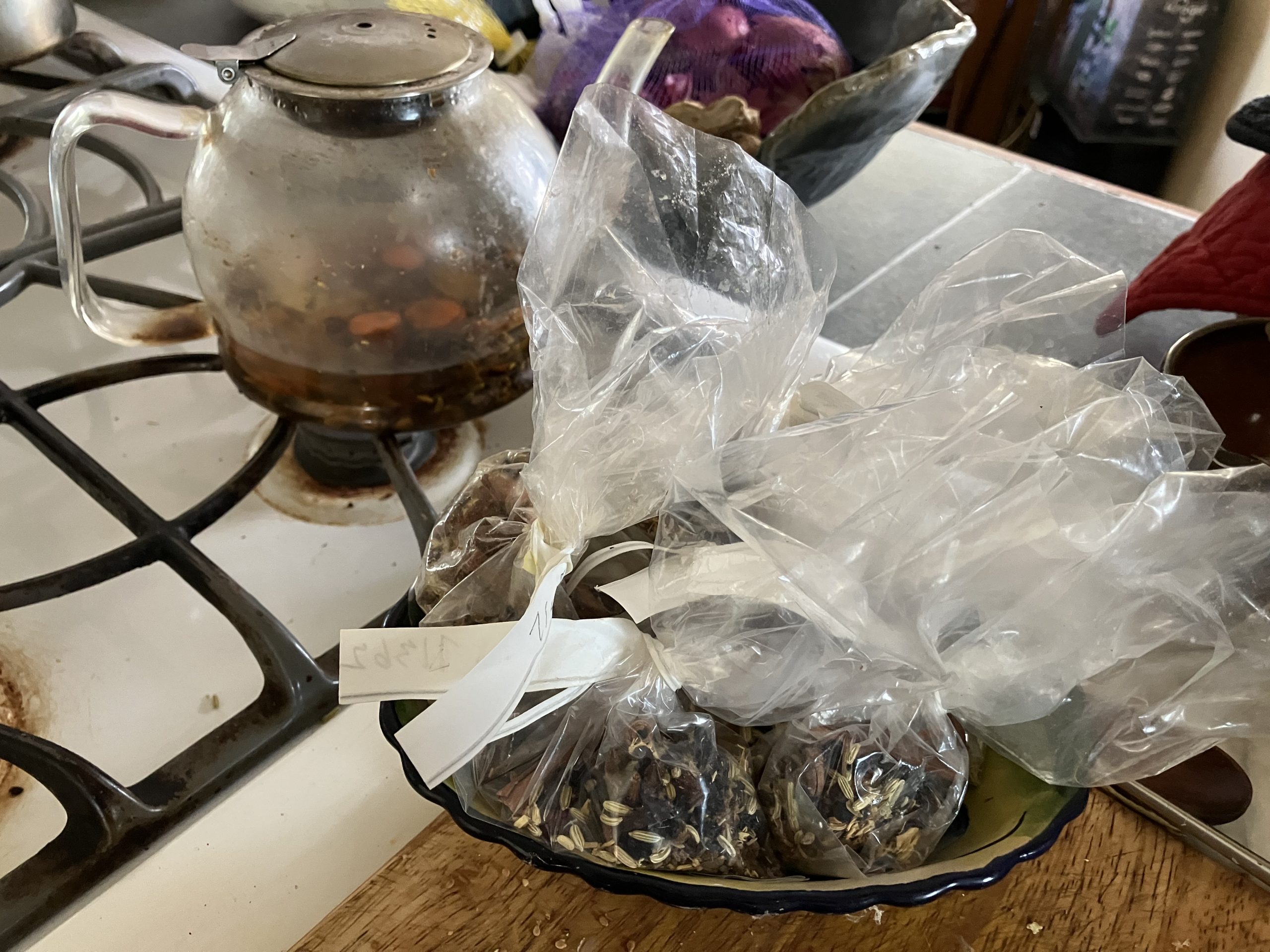 I prepare seven little bundles of these ingredients at a time, and drink four to five cups a day steeped from each bundle two days in a row. (I began this practice 6 months prior to covid.)