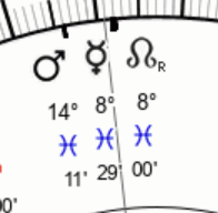 Then there’s the other aspect that leaped out at me: And notice that this one features a totally exact, to the degree, conjunction, between fast moving Mercury and the north node, signifying the direction of the path into the future, but . . both in Pisces! That final sign of the zodiac, that sign that was finally overcome by both Saturn and Neptune, after, literally, years. Yep, we still have a great deal of work to do, to become conscious of, and articulate, all the ghastly sodden gunk that has poisoned the collective unconscious of humanity — wars to the death, child trafficking, blackmail, greed, on and on —