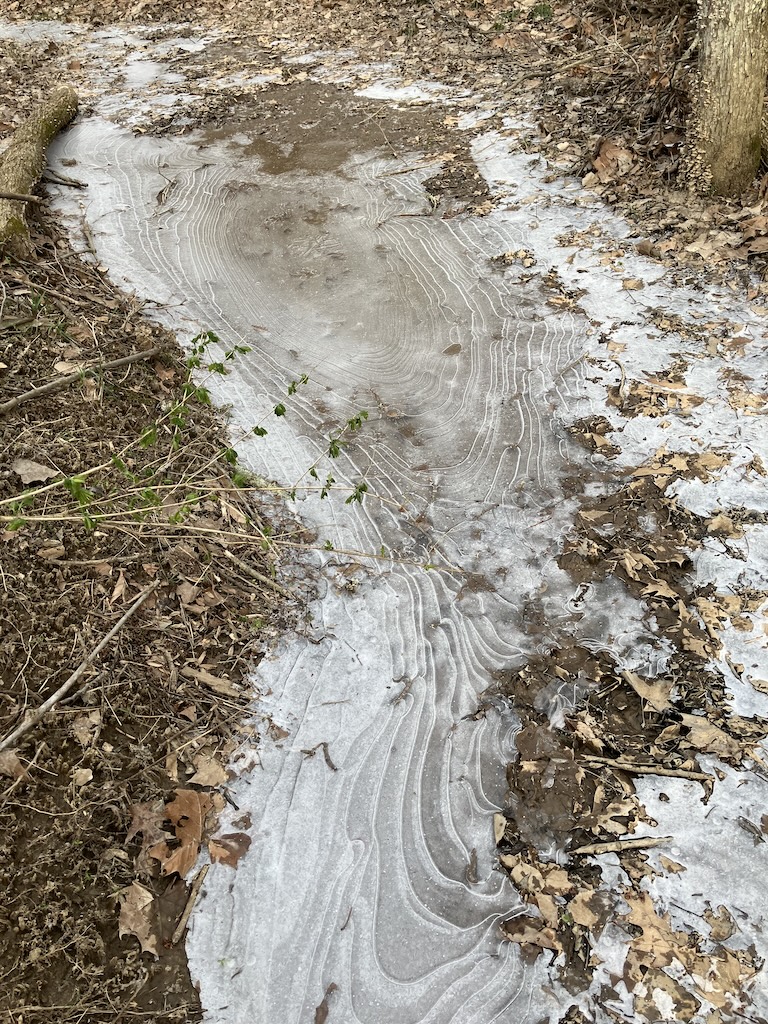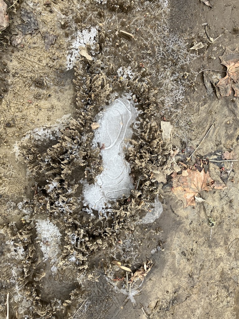 But then, within a few minutes, I got preoccupied. By ice over frozen mud, indicating just what we’ve been through this past week. And especially, the graceful curving patterns made by the ice!