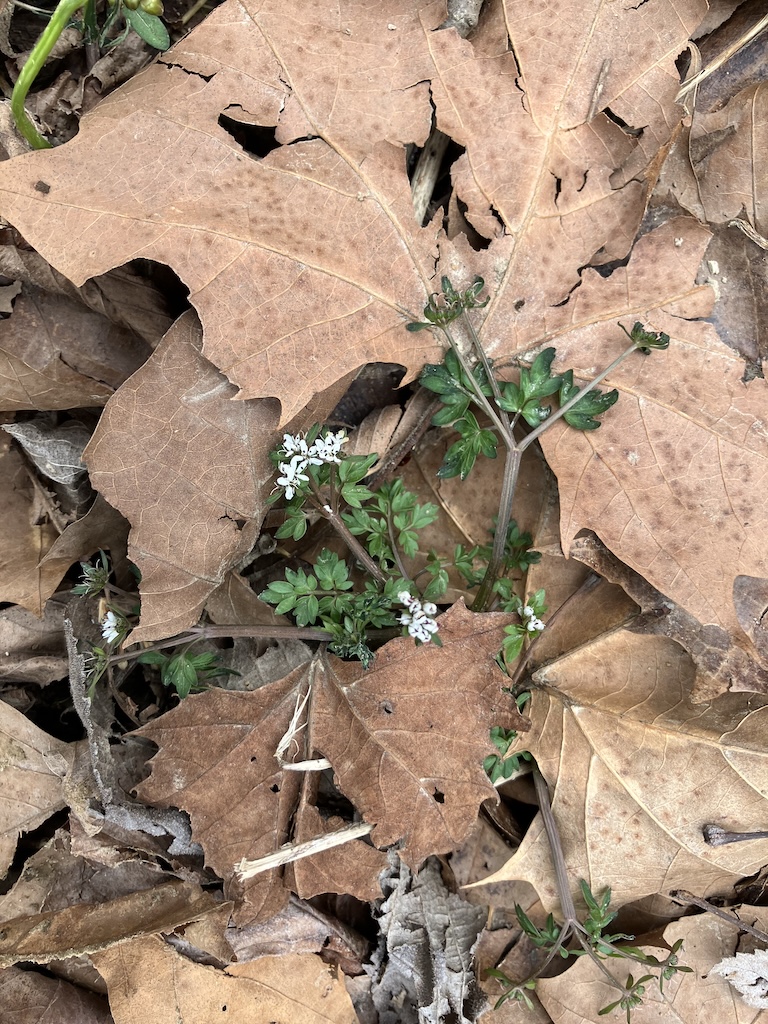 I never did see any real signs of spring . . . until, stopping by the side of the trail and squatting down to pee, this! Tiny flowers!