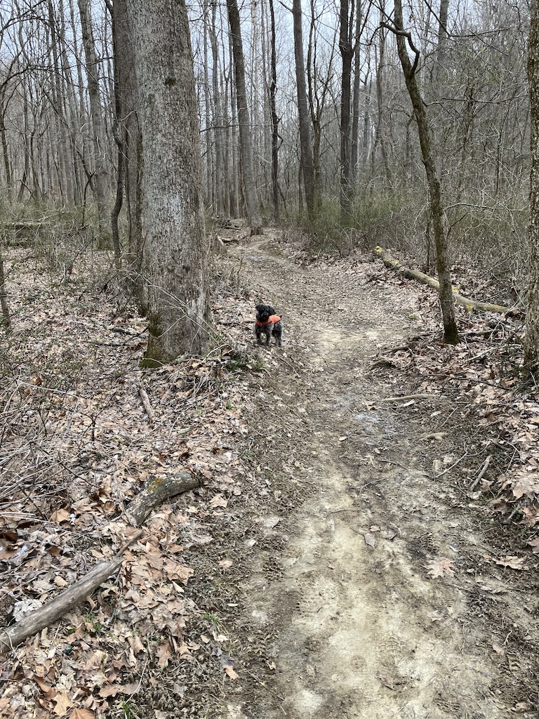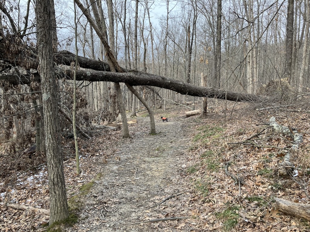 Okay okay. Finally we are on our way back, with Scampi very far ahead. I asked him to please stop, so I could take a photo, with him centered beyond the place where a newly uprooted tree has fallen across the path, only to be cradled by a smaller one on the other side.