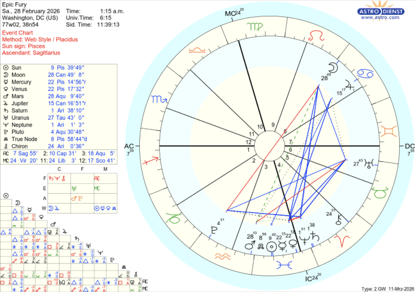 Plus, by the way again, the Epic Fury chart shows Mars at 28° Aquarius, exactly opposite Trump’s Mars/Ascendant in Leo, with both Trump’s planets and the Epic Fury Mars square Uranus in Taurus.