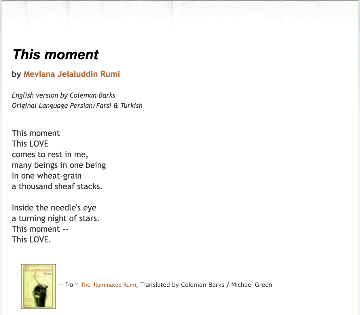 But I don’t say this with Rumi’s mystical sway. I say it on this Monday morning, with, I admit, trepidation, my all-too-human ego utterly terrified of its own extinction.