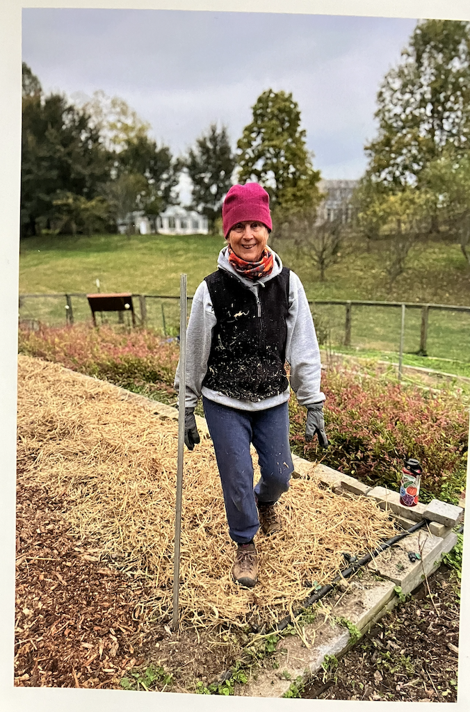 No pictures of me, since I was the one taking them. But here’s a photo that neighbor Carissa took of me about a month ago, on a morning when I had surprised her by driving out to help her with a garden for plants from which she creates dyes. Before her family left for California for the holidays, she sent her 10-year-old son Wyatt over with a poinsetta, a hilarious Christmas card, and this photo.