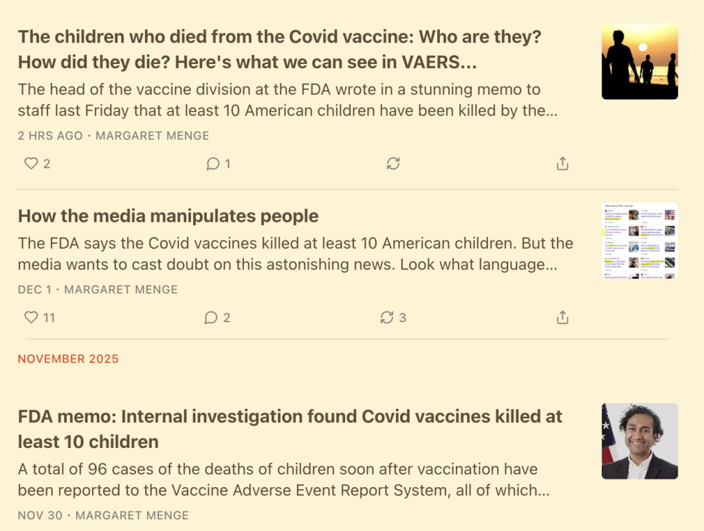 See Margaret Menge, latest three posts on her Crossroads Report. She zeroes in on the FDA’s admission that the covid vax killed ten children. Only ten? I instantly scoffed when I saw that. She added the words “at least”; obviously, she scoffed, too.