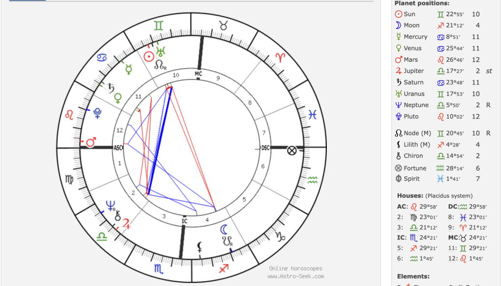 On the other hand, given his intensely curious, indeed likely obsessive interest in getting all the facts, all the info, no matter how unexpected (Uranus conjunct Sun) and putting it in perspective (Sun/Uranus/North Node in Gemini opposite Moon/South Node in Sagittarius), helped by his relations with other people (those planets trine and sextile Jupiter in Libra), I’m frankly, kind of shocked that he didn’t figure out what so many of us knew, much much earlier.