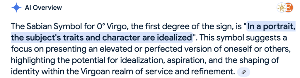 Oh, and check out the Sabian symbol for 29° Leo (always put ahead one degree to 0° Virgo):