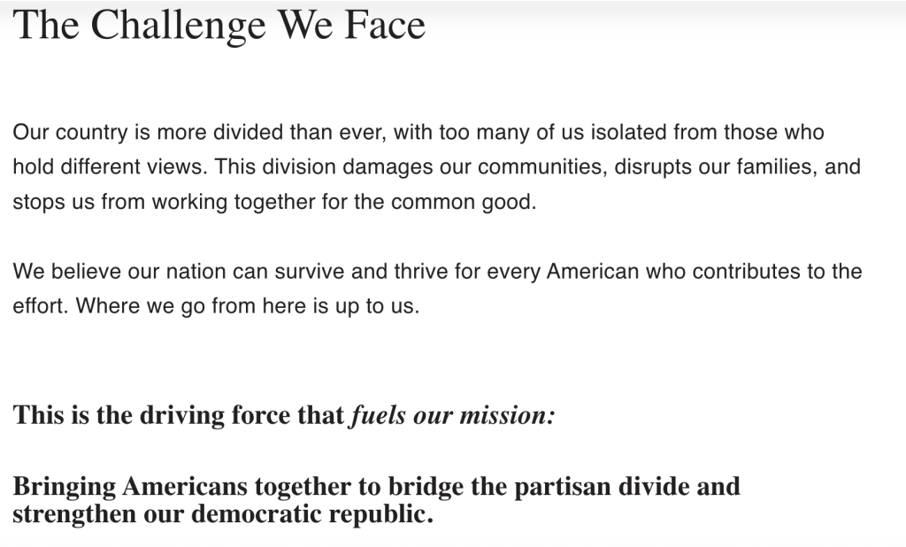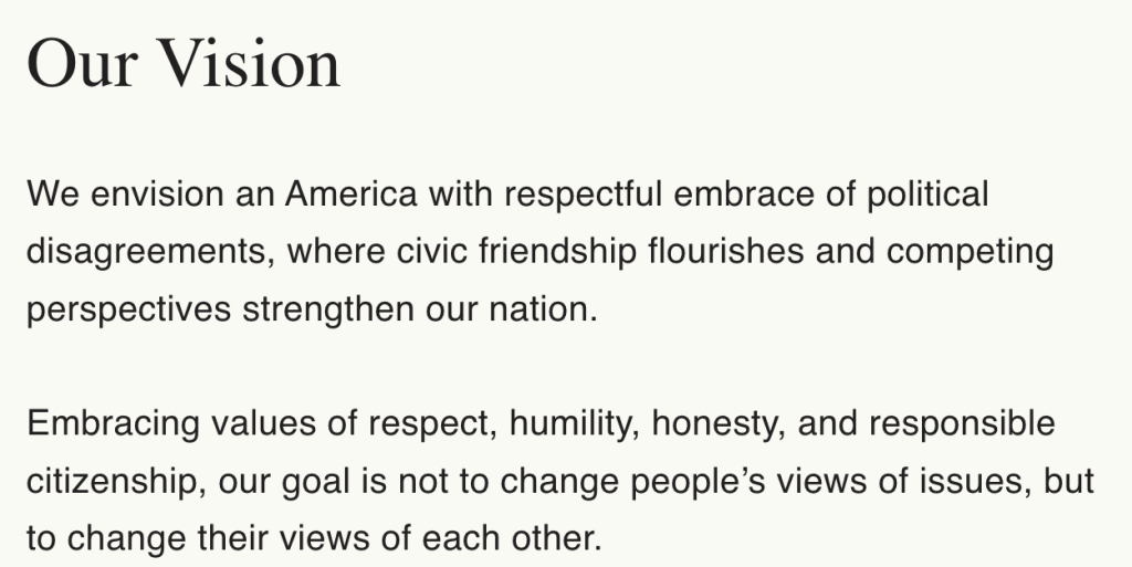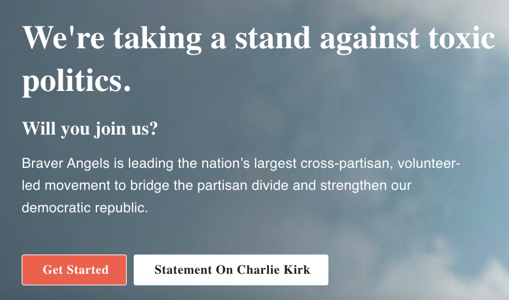 Here’s the Braver Angels website, which I just now joined, and where I learned that Sunday’s event, which coordinated in common cause over 50 national organizations, featuring three panels with four organization leaders on each one, and attended by over 1400 people, was organized within 36 to 44 hours!