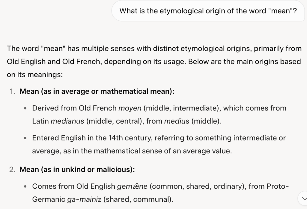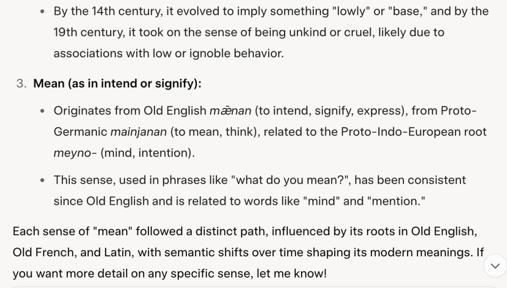 Hmmm . . . What does grok have to say about the little word “mean,” that seems to morph from verb, to adjective, to . . .