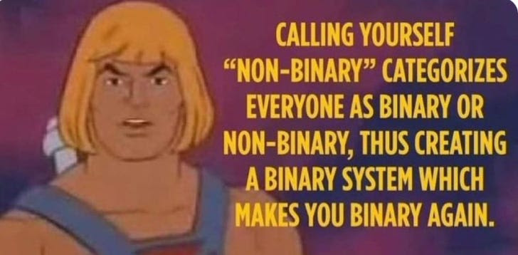 And finally, the best one of all, focusing on how “identity” markers pretend to determine “reality.”
