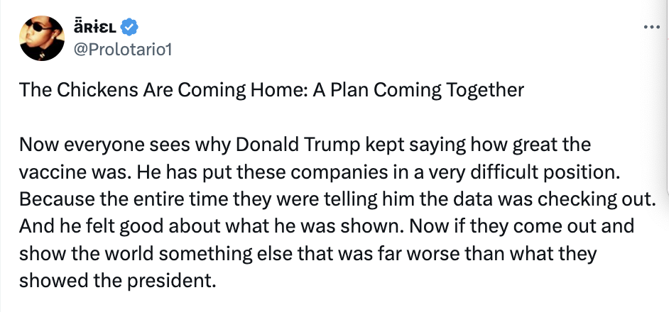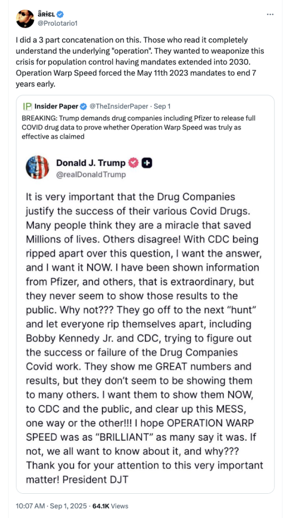 Here’s the original post from Trump that got the broohaha going, with Ariel Prolotario’s comment above. A very important comment: he was one of the few who told us why Operation Warp Speed was crucial: speeding up the vaccine saved civilization from extinction, were it to have been completely shut down for ten years.