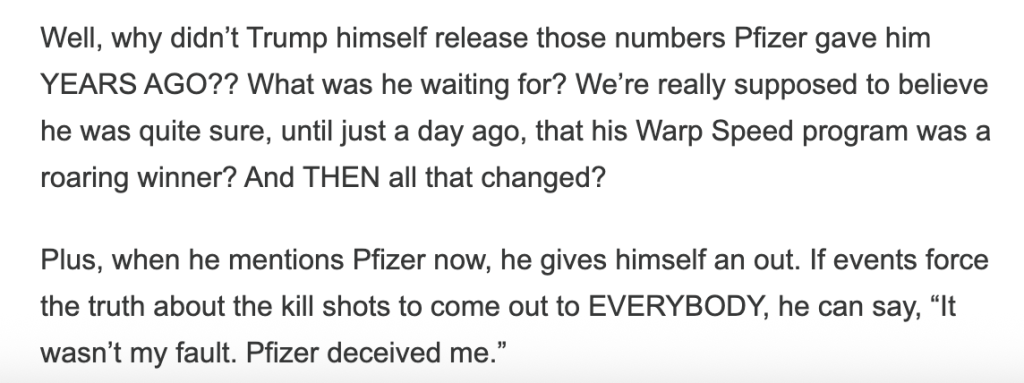 Frankly, I’m surprised that I haven’t seen more regarding the news that Trump has now demanded that Pfizer and others show proof of what they told him (but not the public), that their vaccines are “safe and effective.”