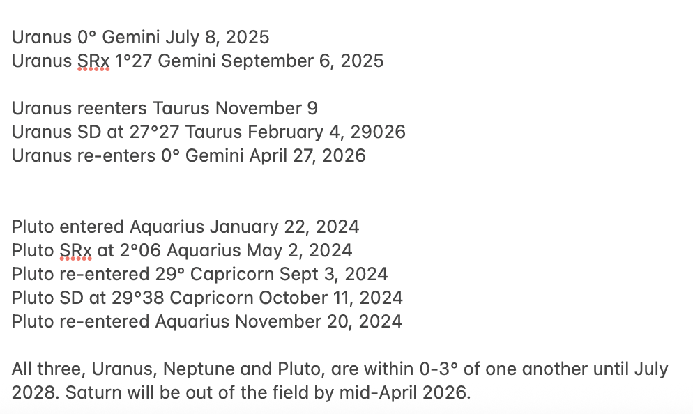 All three, Uranus, Neptune, and Pluto, are within 0-3° of one another until July 2028. Saturn will be out of the field by mid-April 2026. In other words, humanity has until April of 2026 to consciously (using the voices of Trump, Putin, and each of us, in our own sovereign capacity) set the stage for total paradigm shift by July 2028 that will leave our old, paranoid, destructive, constantly warring world in the dust. No going back. No even looking back.