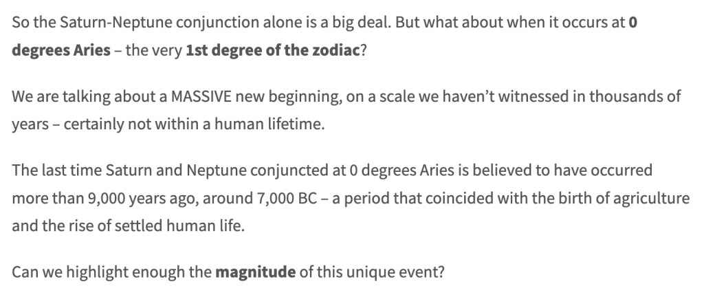 Okay, now let’s back up and ask, when was the last time Saturn/Neptune occurred, not just every 36 years, but when did this conjunction occur at at 0° Aries, the very beginning of the zodiac?. And don’t quote me, but asking AI took me to this astro site, where it states that the last time was actually around 7000 BC! In other words, it’s extremely rare, this massive new beginning that humanity is collectively, unconsciously, aching to achieve.