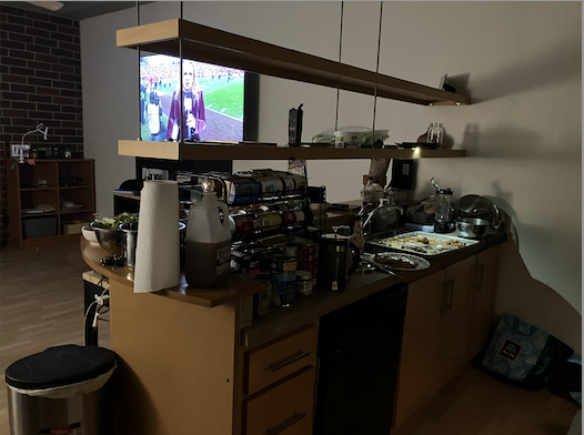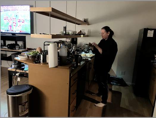 Also, Colin had rolled from the living room into that position in the hall across from the kitchen so that he could co-direct with Marita the preparation of the barbequed wings for which he had created three fabulous sauces beforehand.