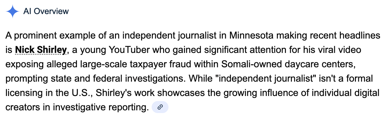 Another living archetype for this new generation is 23 year old Nick Shirley, the independent journalist who just lit up the internet with his investigation into the Somali fraud in Minnesota, that then sent sparks into investigating corruption in other states — Ohio, New York, Washington, among them.