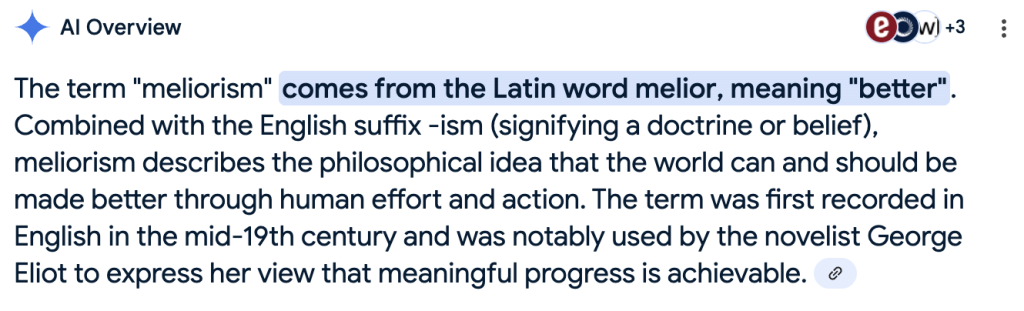 Meliorism: etymology: from the Latin “melior” (meaning better), plus “ism.”