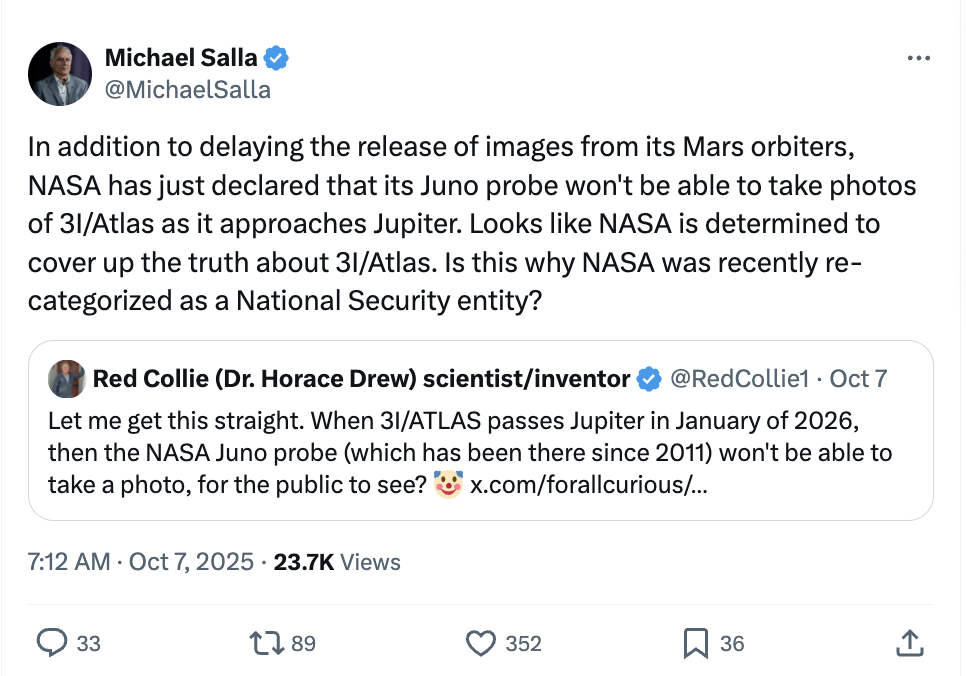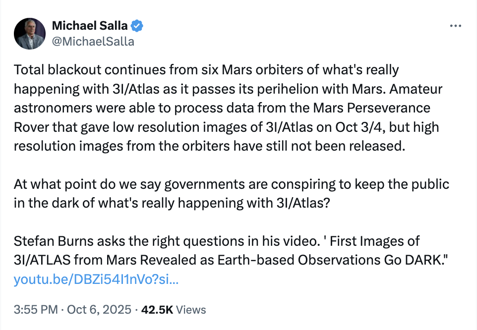Plus: it gets even more interesting: many countries have outposts out there, and could be expected to send us photos when they have them; the world was expecting this, especially when 3I/Atlas went behind Mars on October 3. But: zilch! No photos from anywhere have been released, so far. Which is extremely weird, since countries usually vie for who can be first and best at getting the photos. There appears to be global coordination . . .