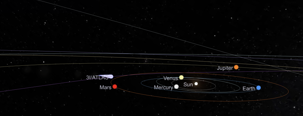When you consider the vastness of space, that an interstellar visitor that has been traveling through our galaxy for what, thousands? millions? of years, was aimed, it appears, directly at our solar system, going behind Mars On October 3, on its way to pass by Jupiter on October 9th, closest to the Sun October 29-30, and closest (but not very close) to Earth on December 19 (my birthday!) — does not its seemingly precisely aimed trajectory, feel intentional?