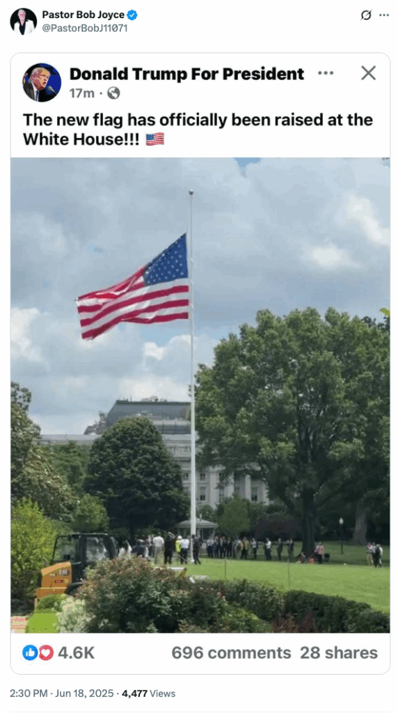 Why has there not been a giant flag at the White House all along? Or was there? Did there used to be? What is the symbolism implied here? Remember: the Army was in full force during the April 14th parade — which was not only the 250th anniversary of the Army, and Trump’s 79th birthday, but, I just realized, also “flag day”!