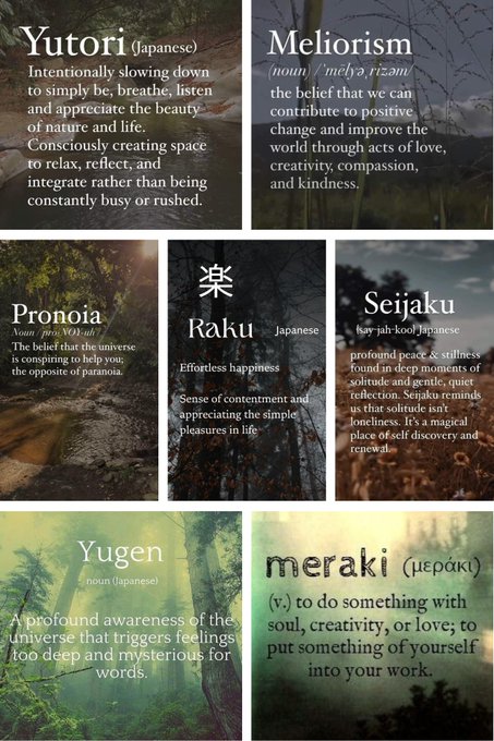 Yugen: Etymology: Made up of two Japanese characters. The first, “yu,” means dim or difficult to see. The second, “gen,” originally described the dark, tranquil color of the universe—something calm and deep.