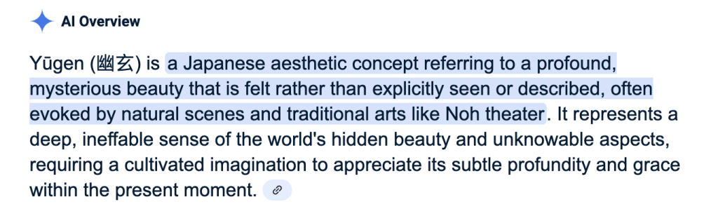 Or as Alan Watts put it: yugen means “digging change”! Also: “Openness. Something your spirit goes out into, and has nowhere to land. The trick is, to evoke the mood of yugen, a sort of mysterious suggestiveness.” Wonderful video.