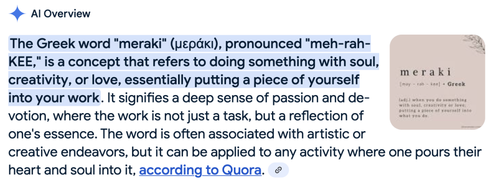 Meraki: etymology: Here’s a post that says it literally means “essence of ourselves.”